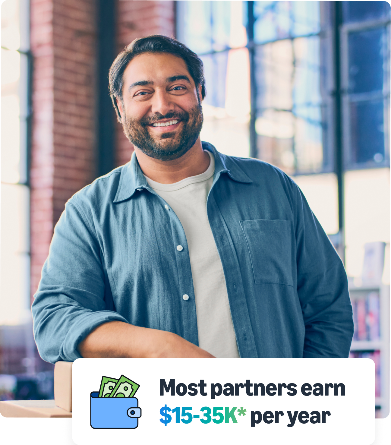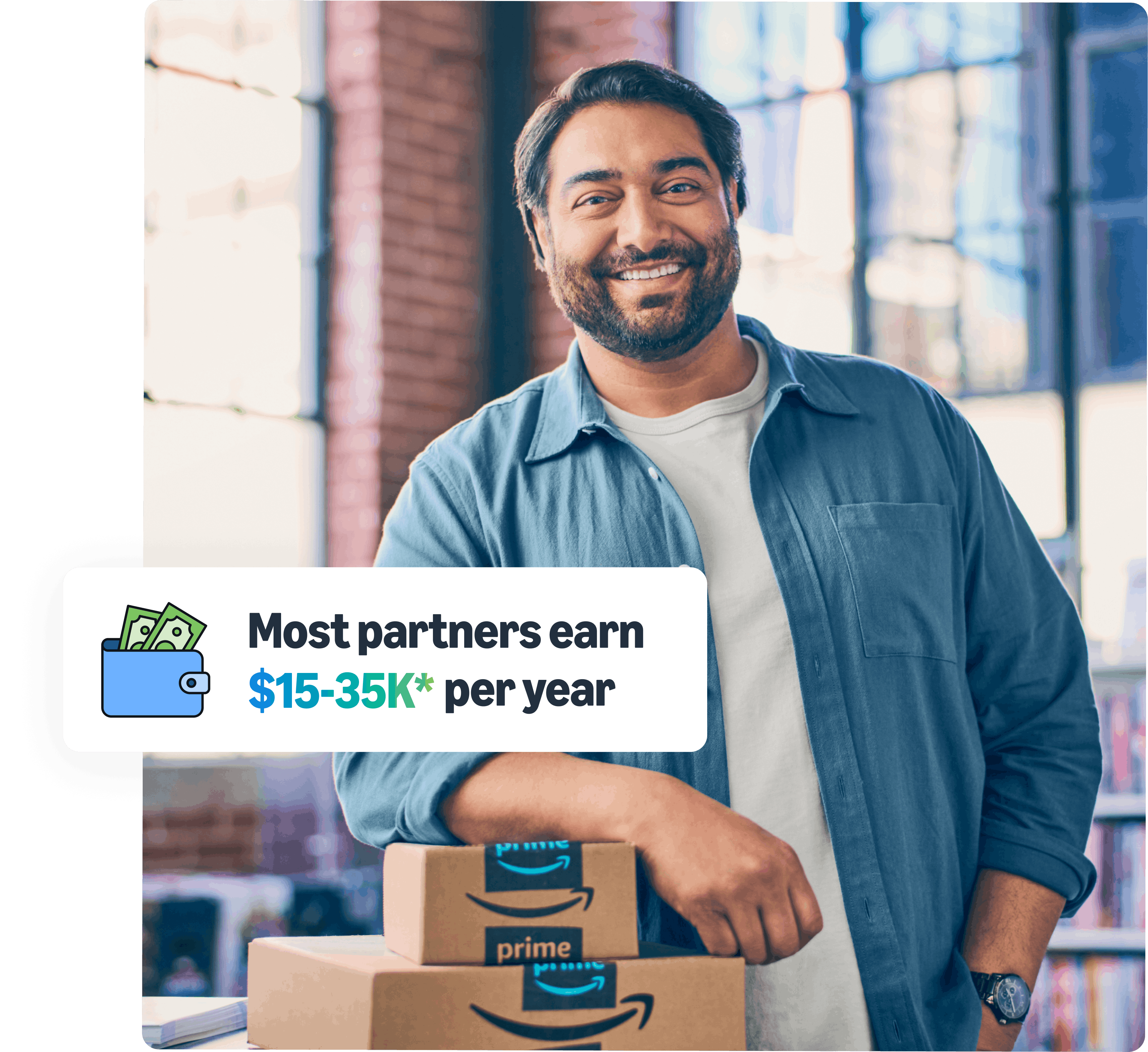 Most partners earn from $15k to $35k* per year. Disclaimer: *Figures are revenue projections. Actual revenue will depend on your location, number of packages delivered, and other factors. See details.